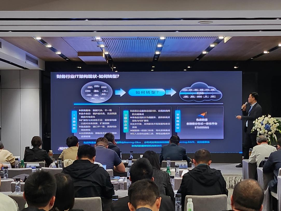 J9国际站 J9代表讲师郭钰以《昆仑与J9国际站 J9ESB解决方案助力财务行业创新与架构转型》为主题作发言分享。他深入剖析了当前财务行业IT架构面临的挑战,包括系统孤岛、技术老旧、扩展性不足等问题,并提出了基于企业服务总线(ESB)和微服务架构的转型方案。